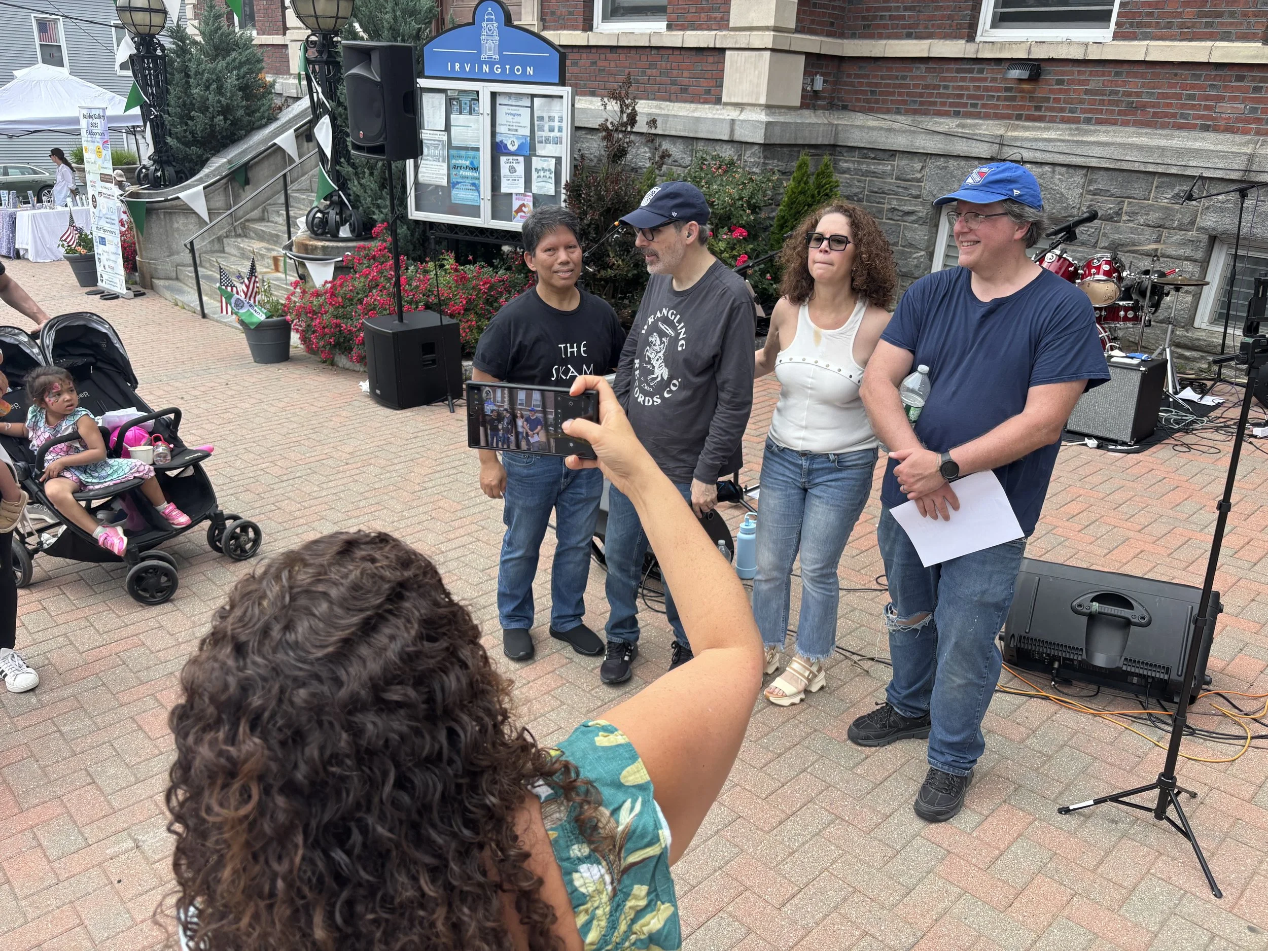 Each of the 23 Bulldog statues around Irvington has a colorful sticker on the side of its pedestal.